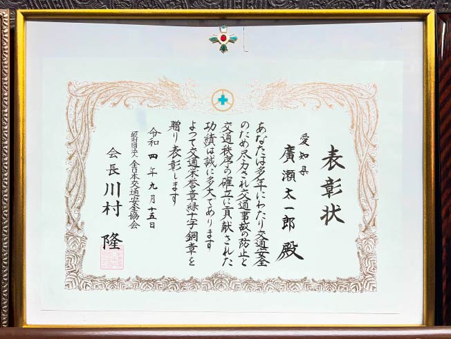 | 2012年(平成24年) | 社団法人愛知県トラック協会・中部交通共済協同組合・愛知県中警察署/無事故・無違反認定証 |