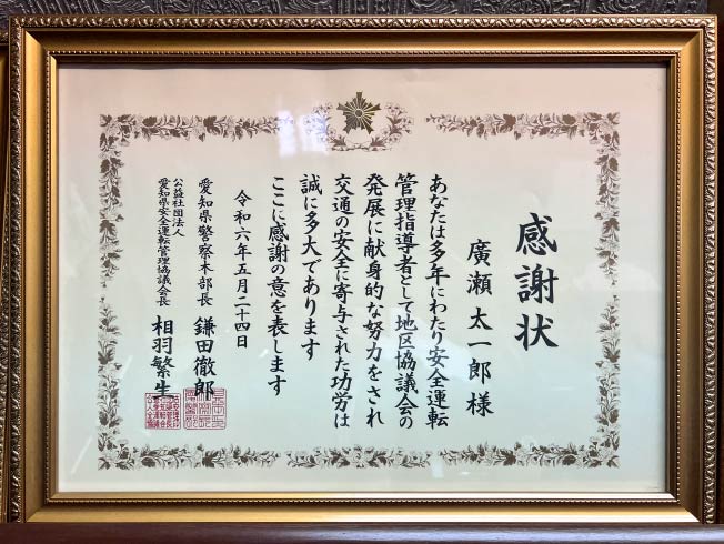 | 2024年(令和6年) | 愛知県警察本部・愛知県安全運転管理協議会/安全運転管理指導者としての活動に対する感謝状 |